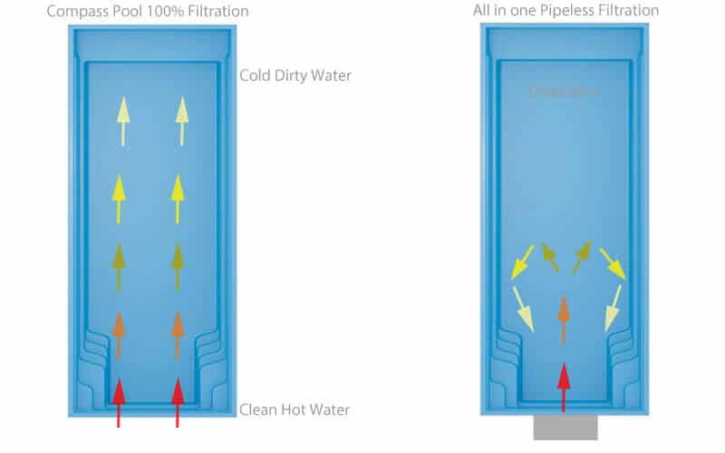 A conventional filtration system designed to both SPATA (Swimming Pool and Allied Trades Association) and ISPE (Institute of Swimming Pool Engineers) standards will suck out the water from one end of the pool, filter, clean, heat and treat before returning to the opposite end of the pool – a bit like a river bed. Logically, this makes perfect sense as there are no dead spots or areas of stagnant water in which that bacteria and algae can breed and this also eliminates the issue of cold water spots. For this reason you will not find a Spata or ISPE member offering a pipeless filtration system as the standards can not be met with the water being sucked and pushed from the same place. Whoever you choose to buy a pool from, whether its Compass or otherwise, we always recommend they are a SPATA Member.