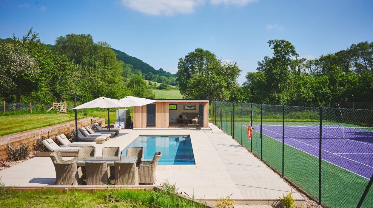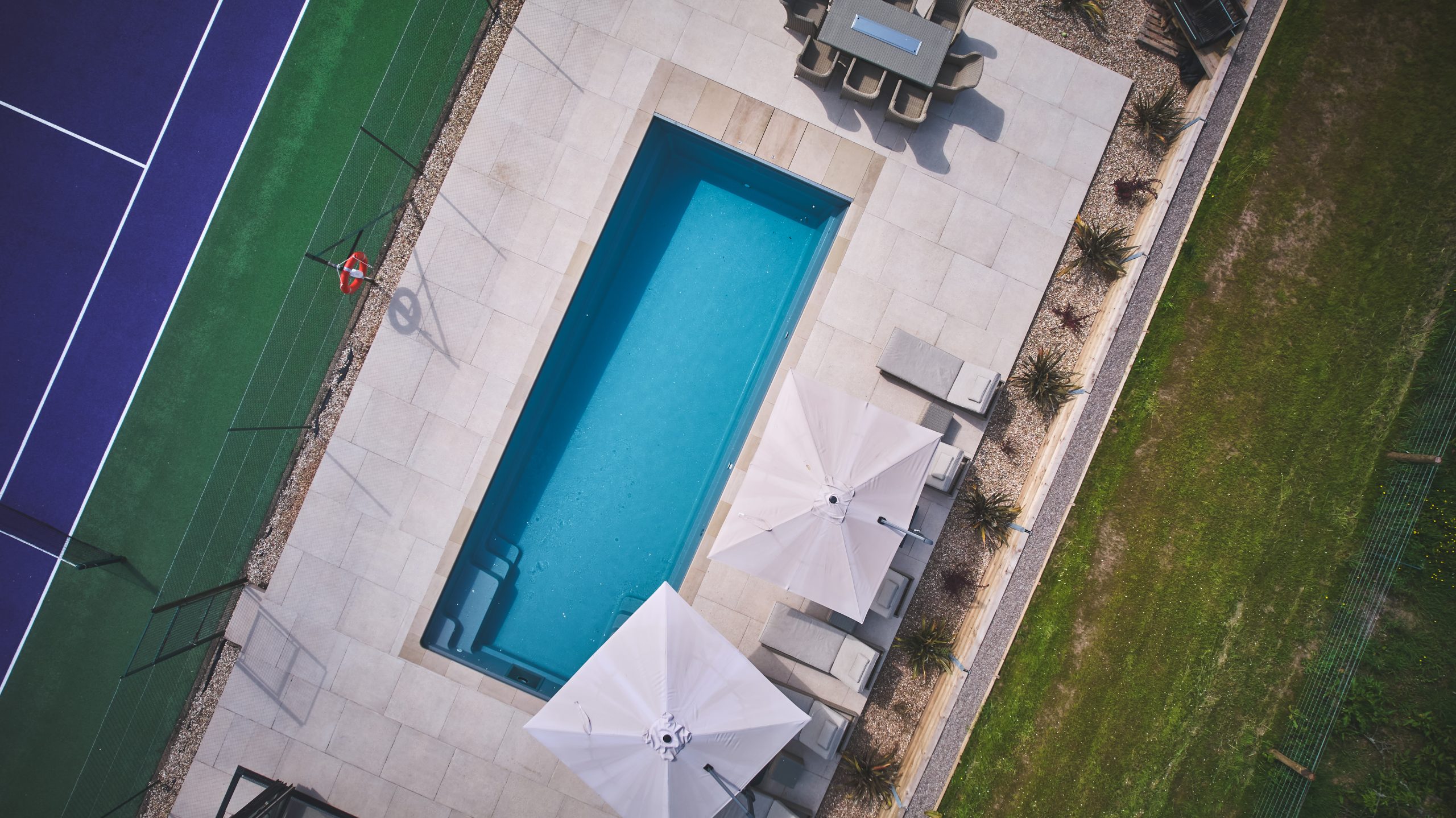 The installed pool is an XL-Trainer 110 model, chosen for its sleek lines and spacious layout. The pool features a Nova Gray ceramic shell, harmonising beautifully with the sandstone coping stones to create a sophisticated and natural look. The surrounding area is finished with matching tiles, providing a generous space for lounging and dining, while the nearby tennis court and scenic views further enhance the outdoor experience.