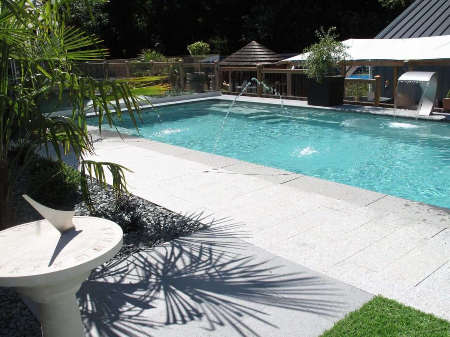 A successful swimming pool design should factor in more than just the pool itself. The surrounding paving needs to be hygienic and safe for those using the pool, and there are various materials you can choose. Wood adds a rustic, traditional look to your swimming pool and can be warm to the touch, while marble is cooler and adds an elegant appearance. Natural stone absorbs very little water and is easy to maintain, while a low-cost alternative is cement which doesn’t require much maintenance.